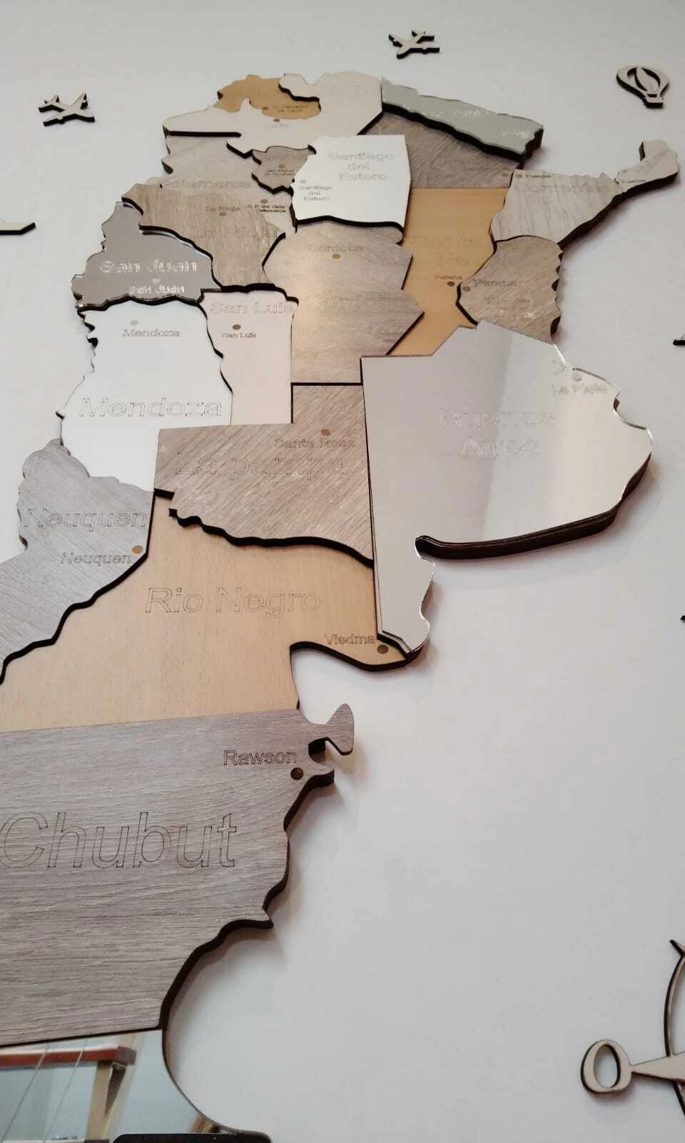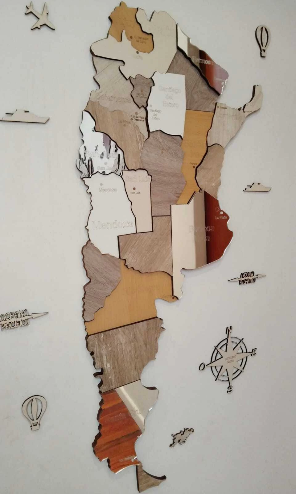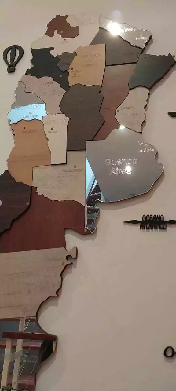 Cuenta con el nombre de cada provincia y sus capitales grabados sobre la madera.