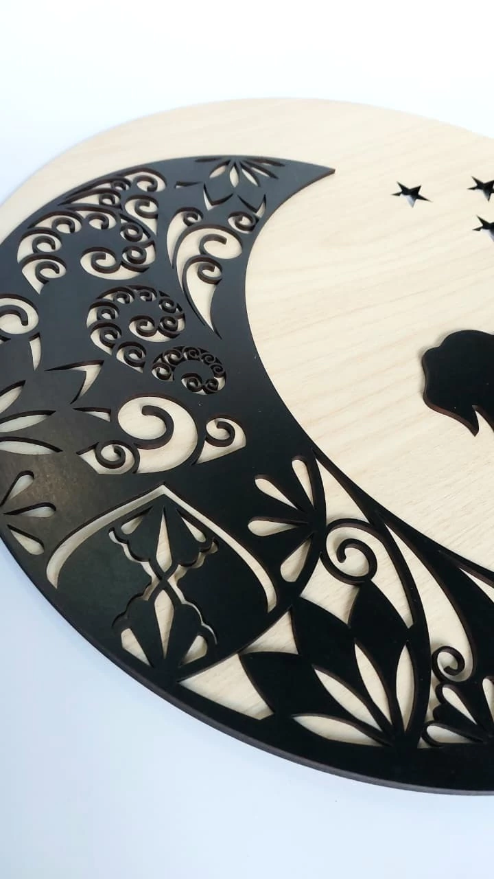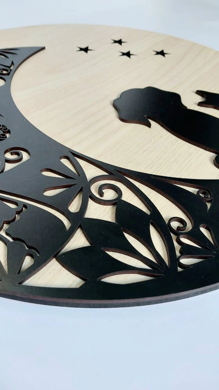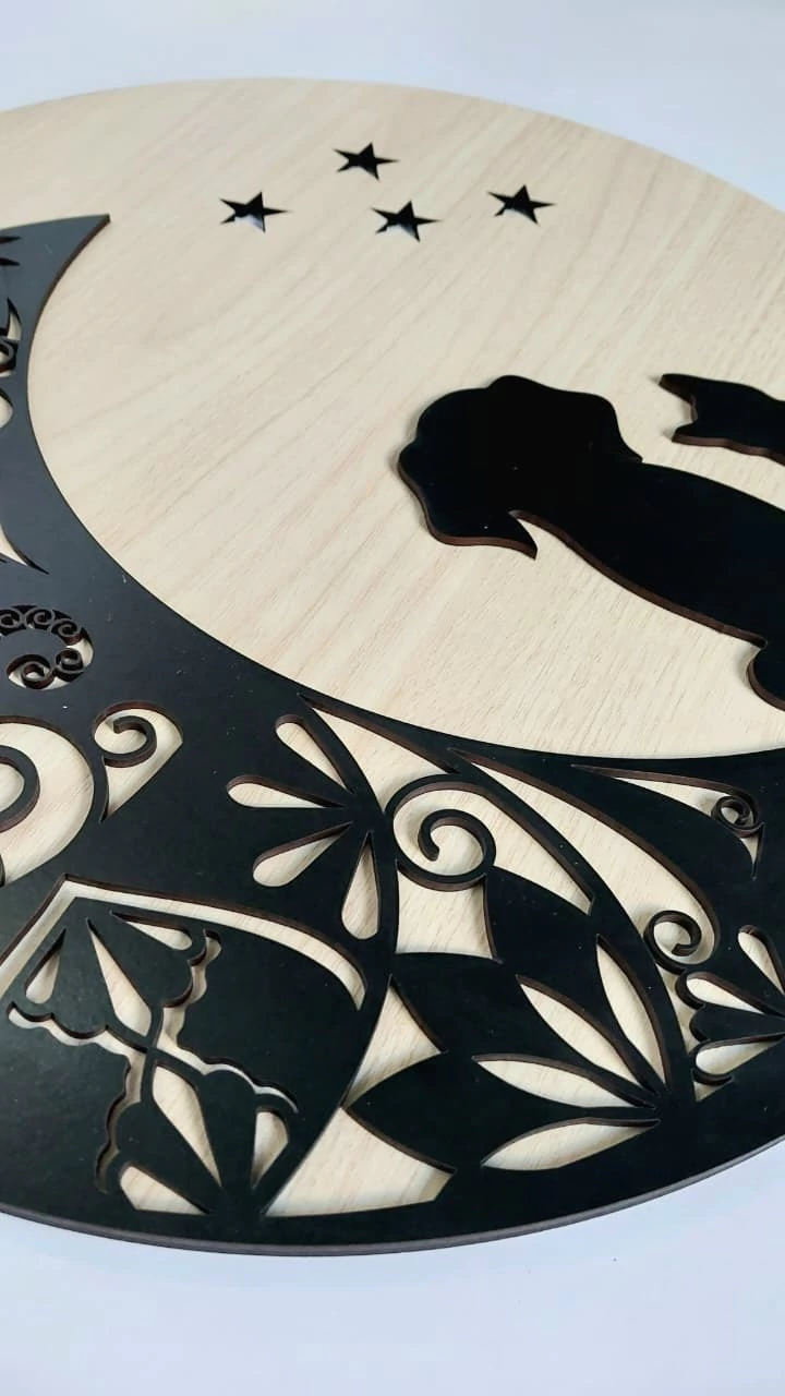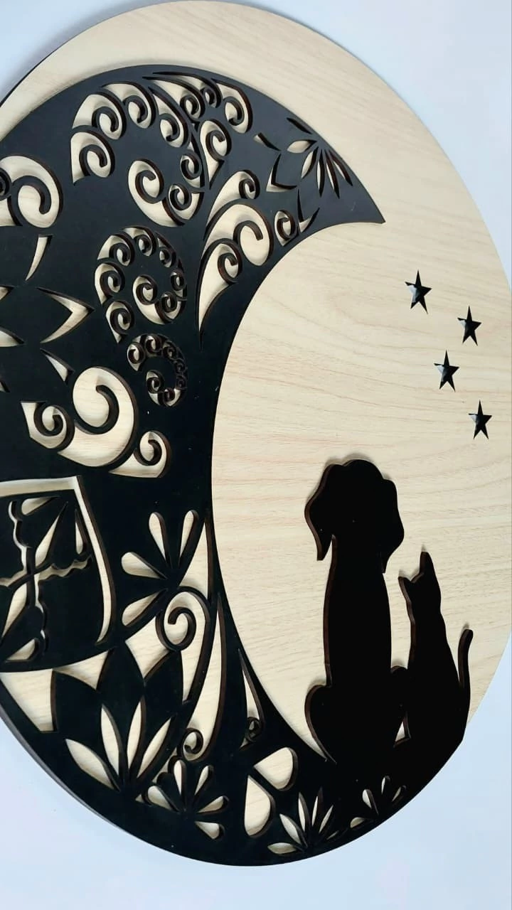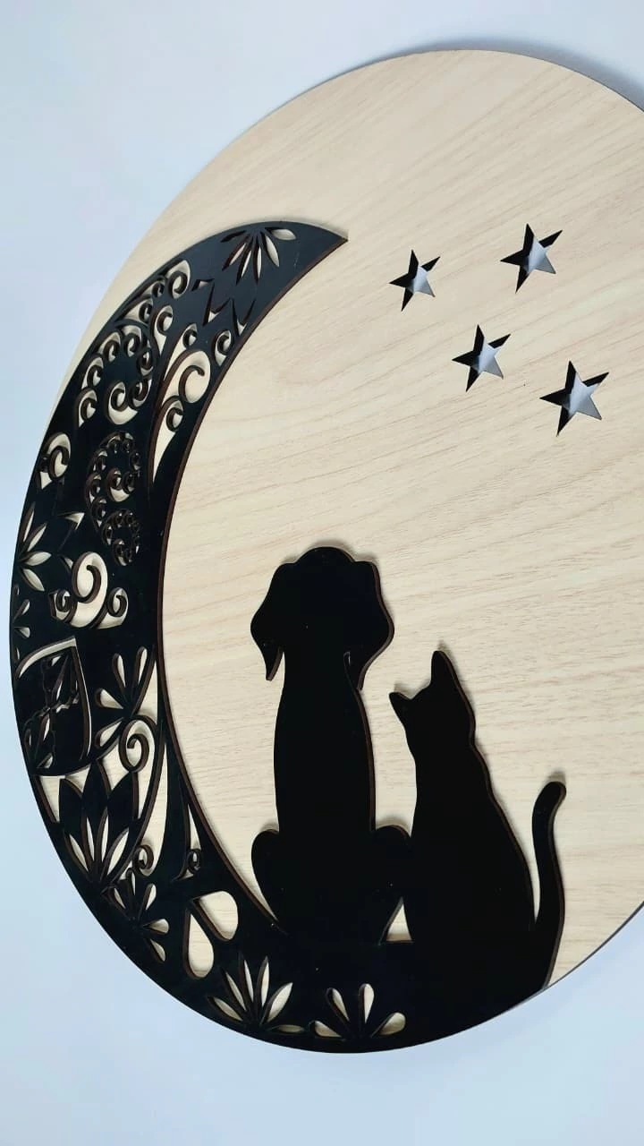 Cuadro Luna Gato y Perro en Capas Decora tu hogar con esta exquisita pieza que combina la serenidad de la luna con la ternura de un gato y un perro, elaborados en capas para un efecto tridimensional único. Los delicados arabescos que rodean la luna aportan un toque de elegancia y sofisticación a cualquier ambiente.