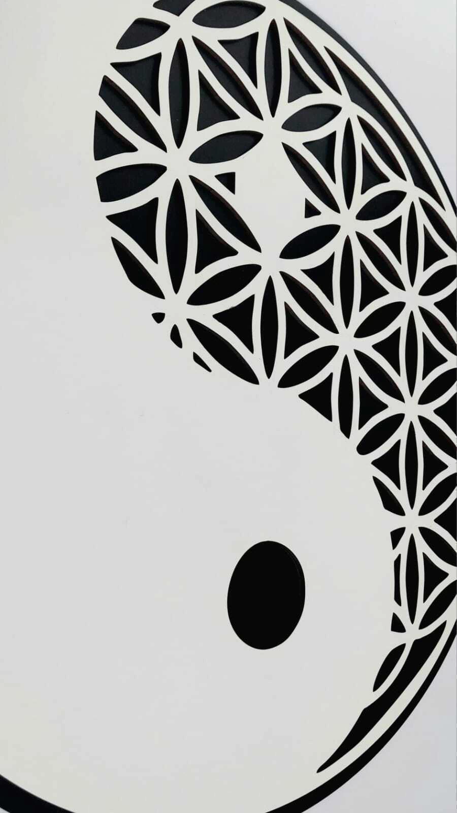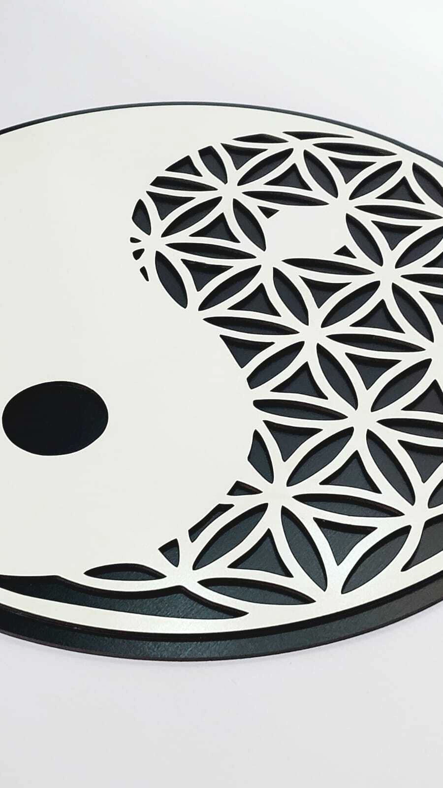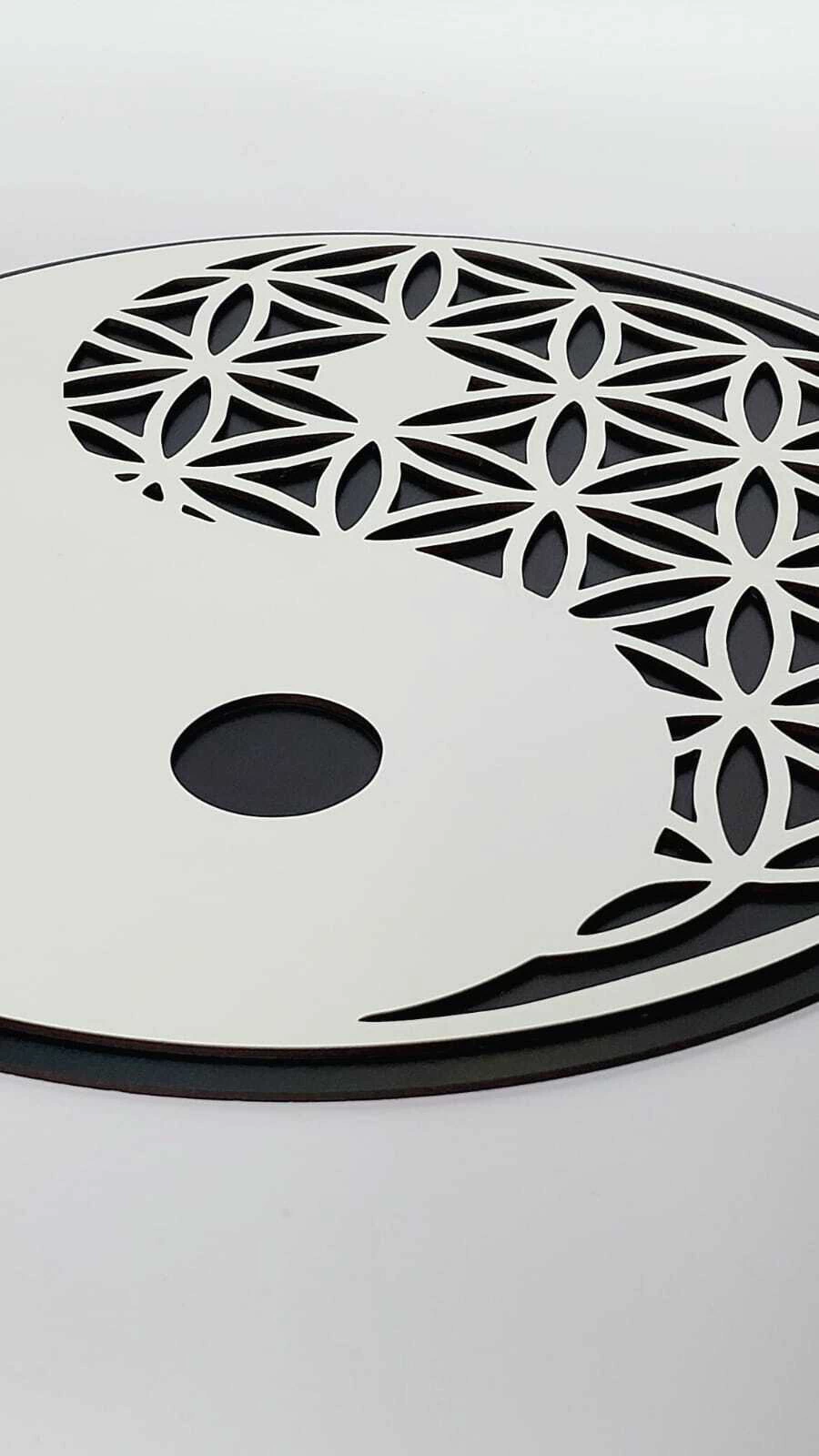 Decora tu espacio con este cuadro en madera calada que combina el símbolo del Yin Yang y la Flor de la Vida, representando la unidad y el ciclo de la vida.