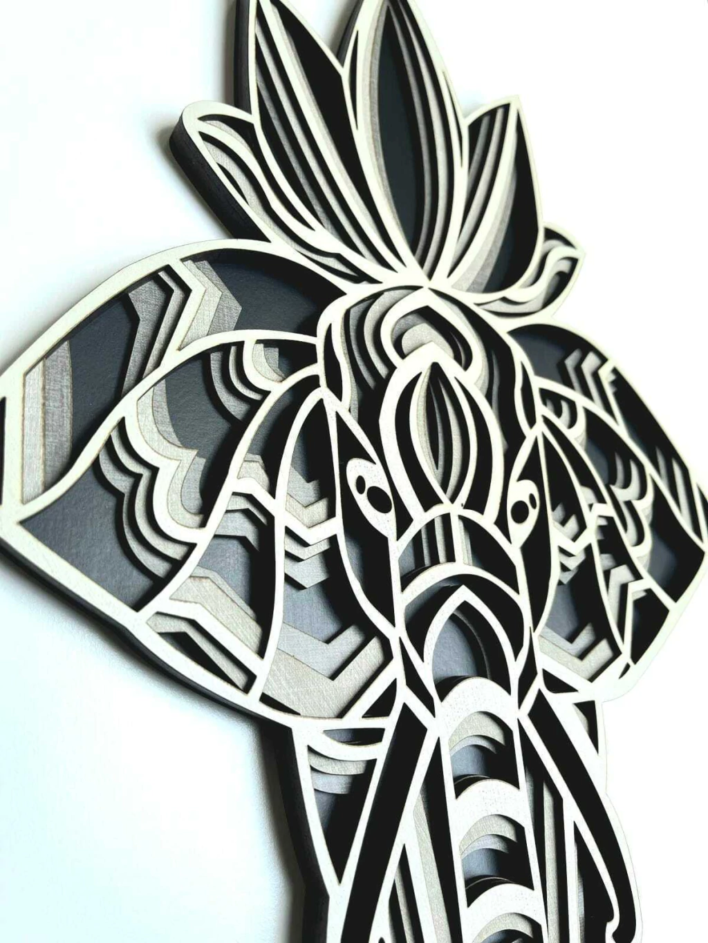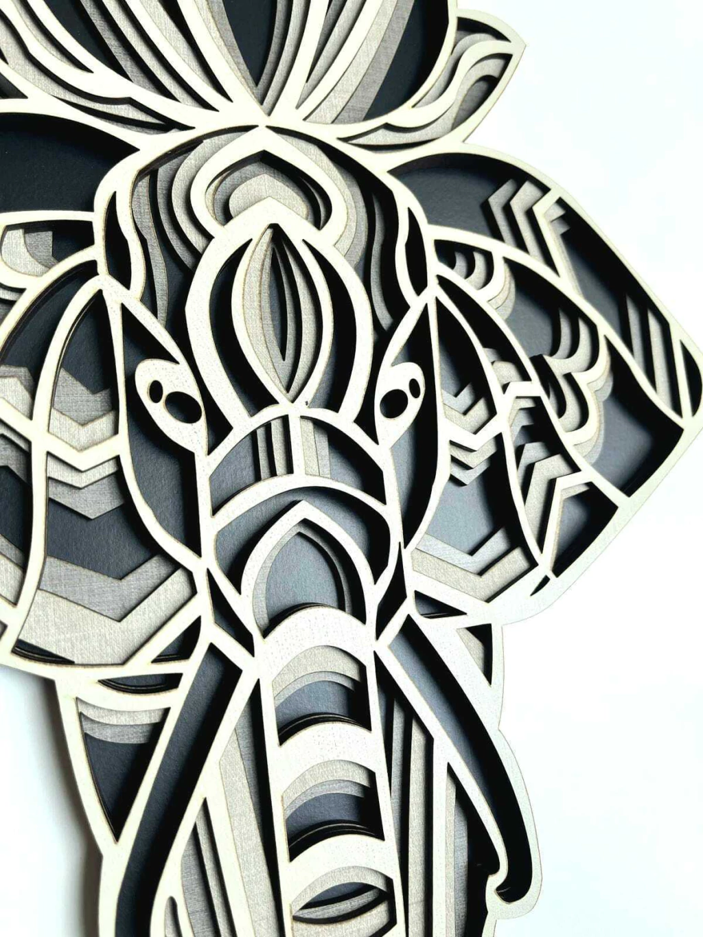 Tamaño: 50 cm de alto x 30 cm de ancho. Este impresionante diseño presenta un elefante mandala con una flor de loto, elaborado con multicapas de derivados de la madera. Cada capa, en diferentes colores, se superpone para crear una imagen final que destaca por su profundidad e interés visual. Ideal para decorar cualquier ambiente, esta obra de arte agrega un toque de elegancia y serenidad a tu hogar.