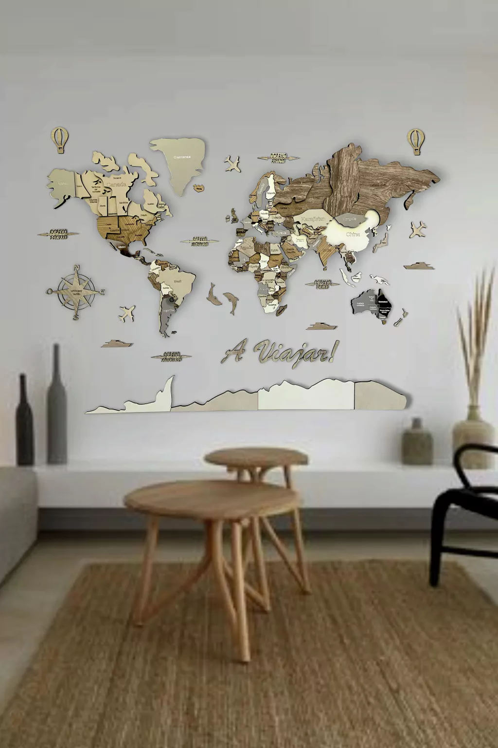 Realizado con maderas de distintos colores y superficies espejadas, con diferentes grosores para crear el efecto de 3 dimensiones y países espejados que aportan mas luminosidad y dimensión al conjunto.