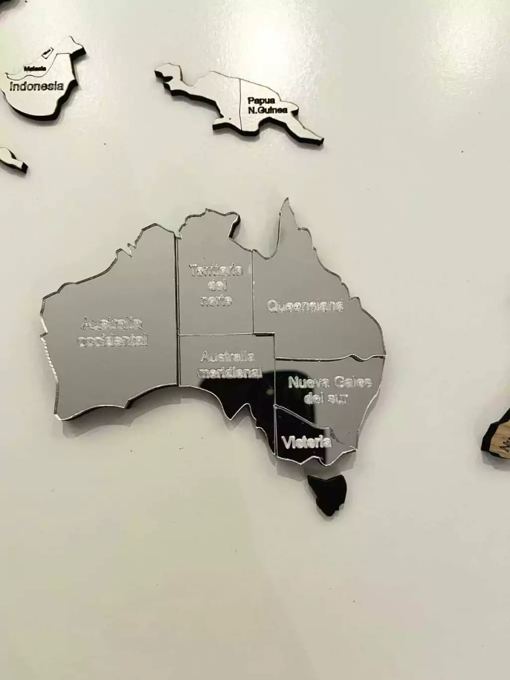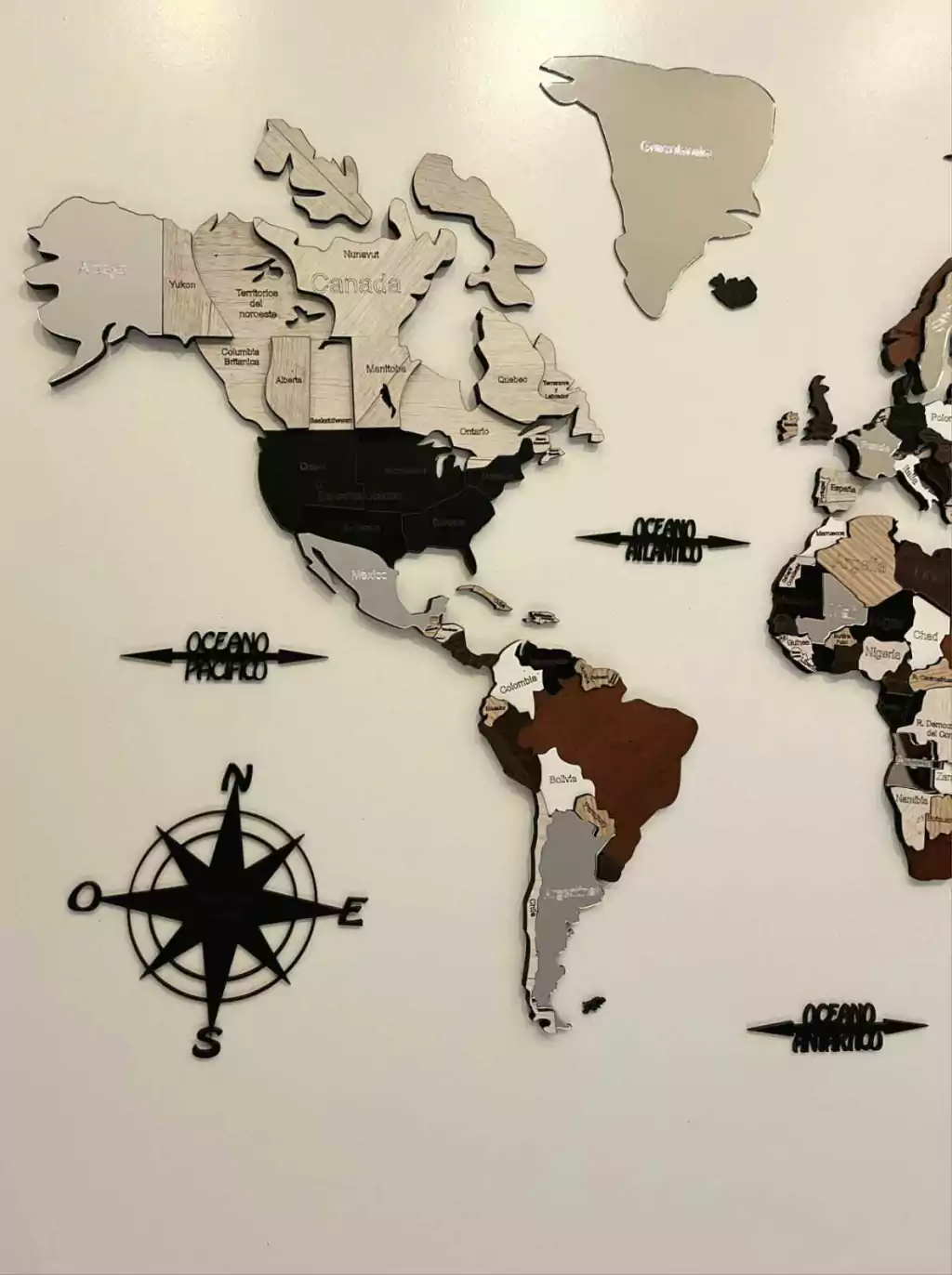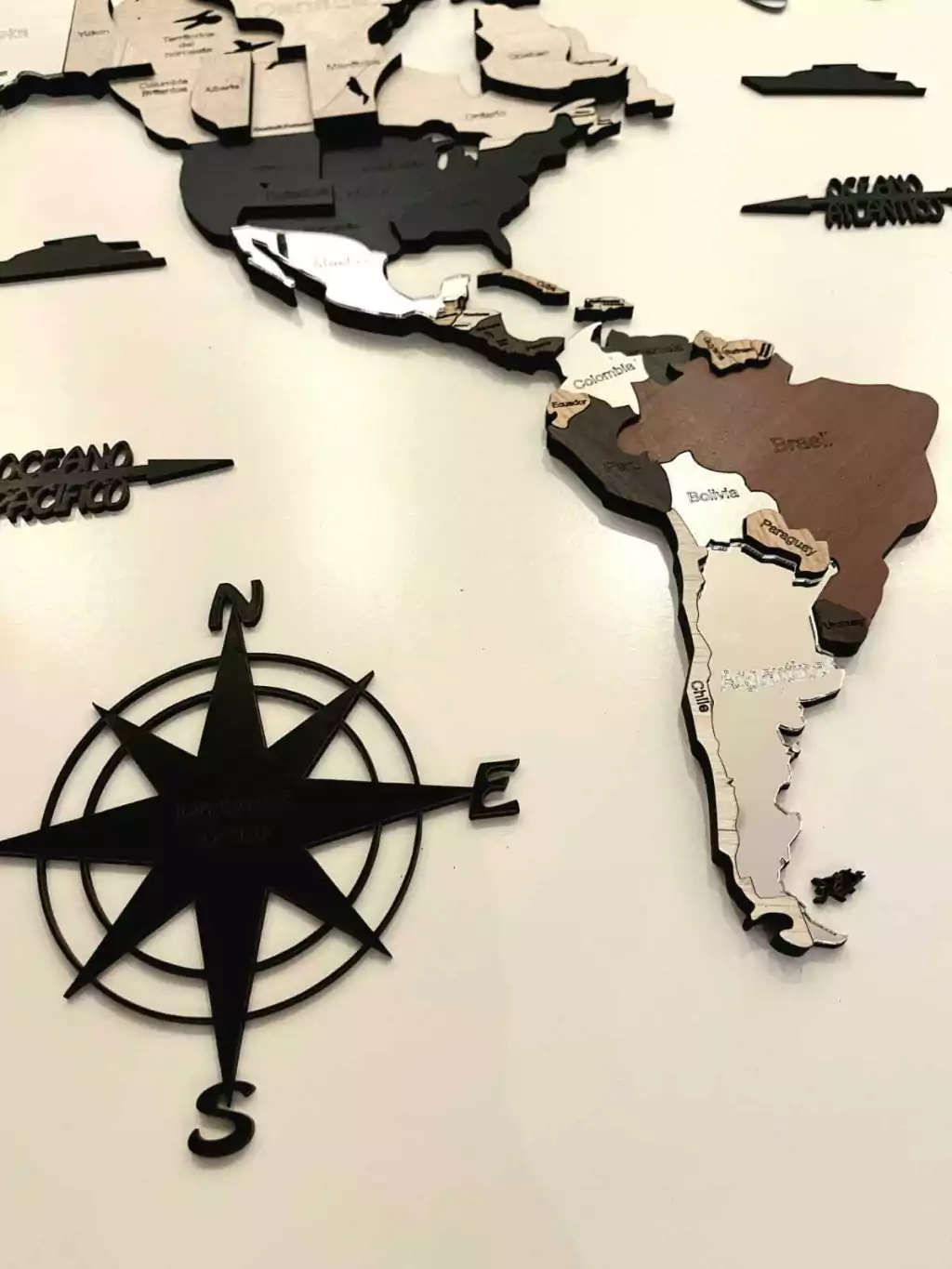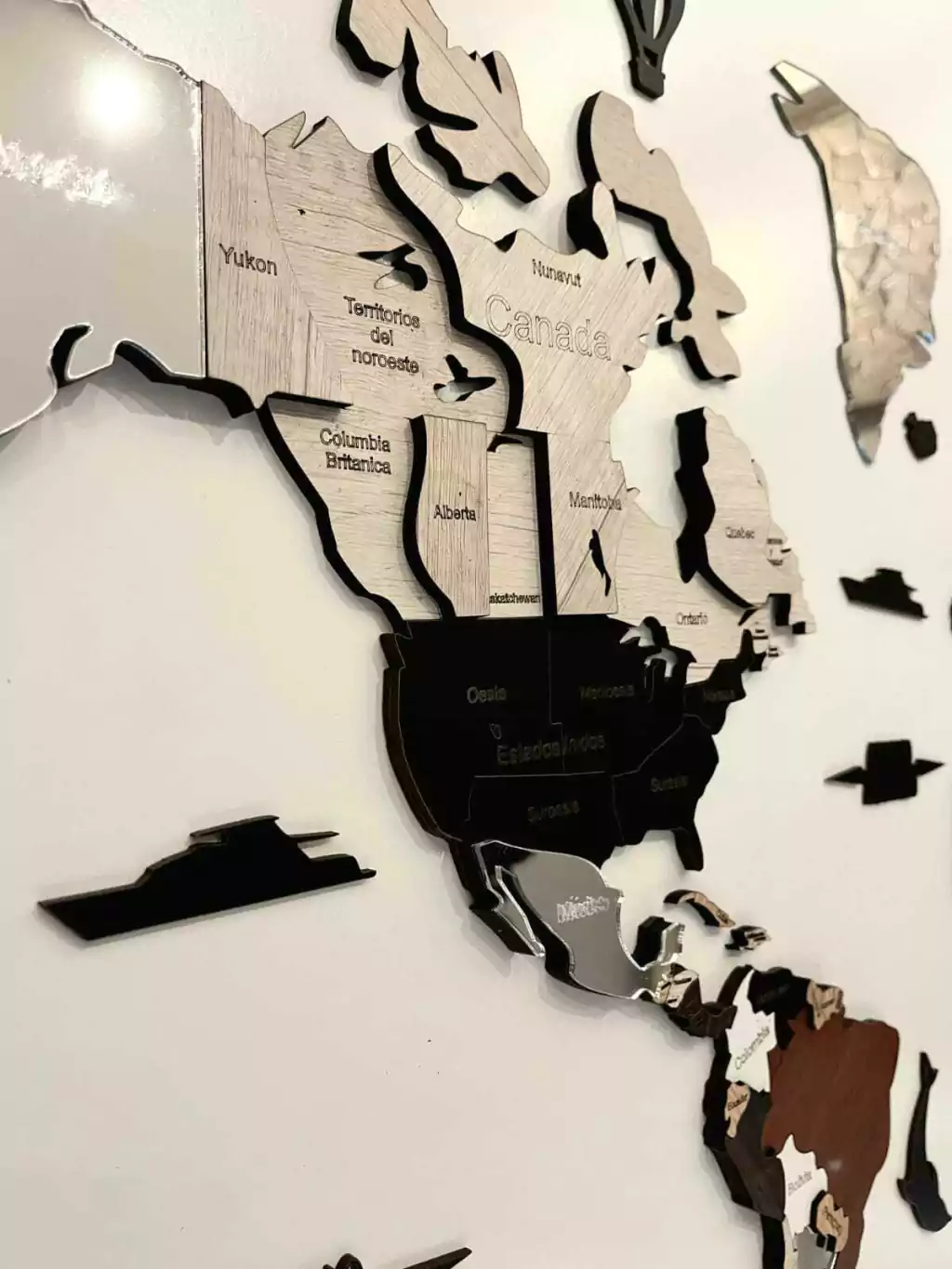 Realizado con maderas de distintos colores y superficies espejadas, con diferentes grosores para crear el efecto de 3 dimensiones y países espejados que aportan mas luminosidad y dimensión al conjunto.