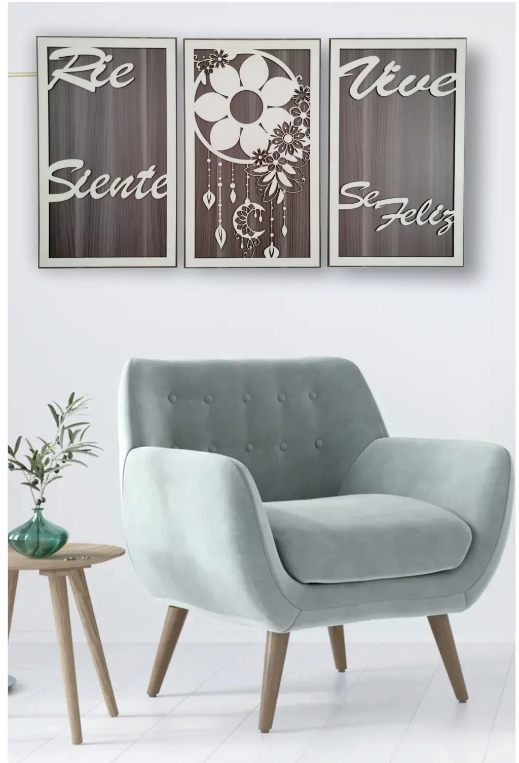 Este hermoso cuadro tríptico está realizado en madera con diferentes vetas y texturas, creando un efecto visual único. Los detalles calados generan un juego de luces y sombras que realzan su belleza.