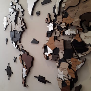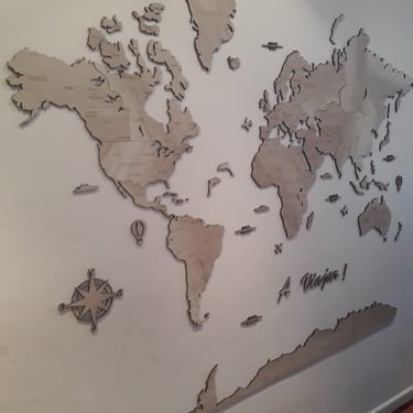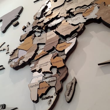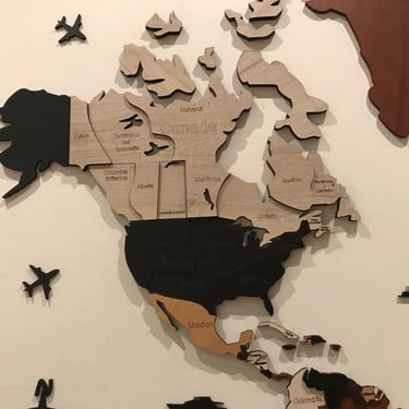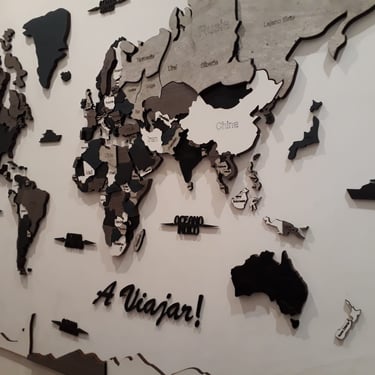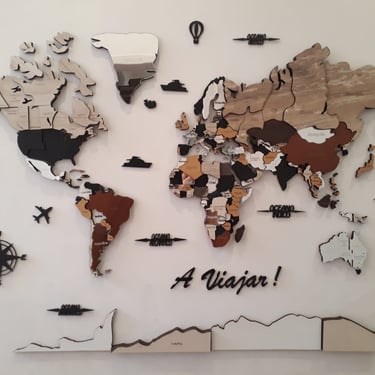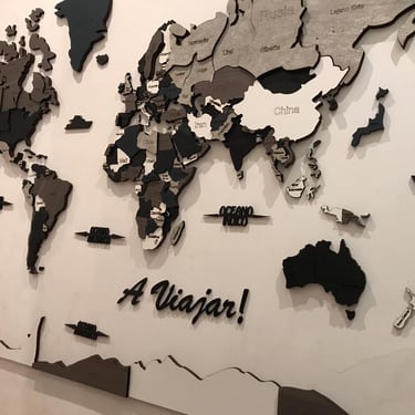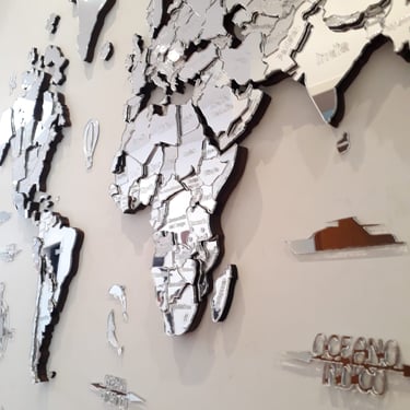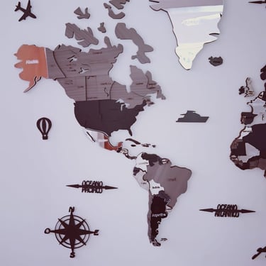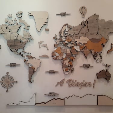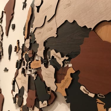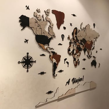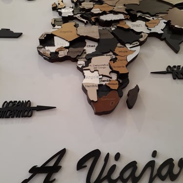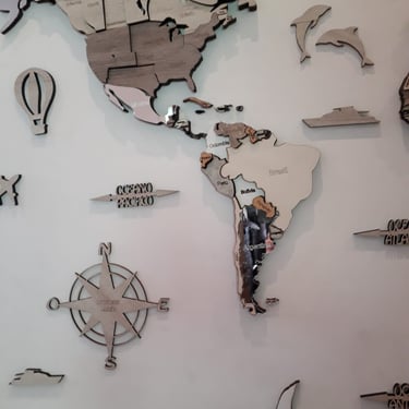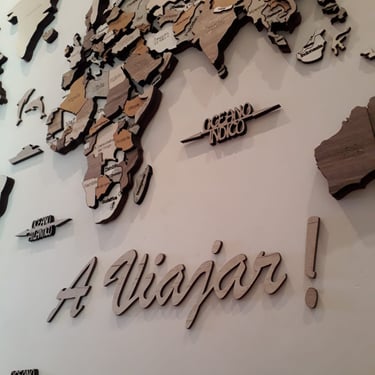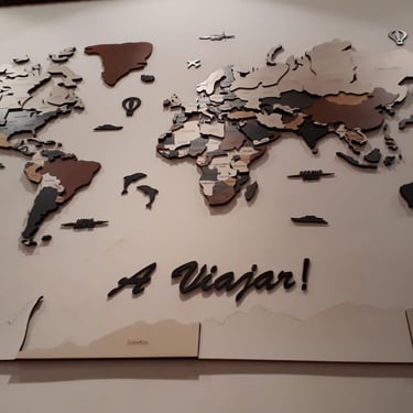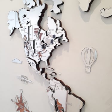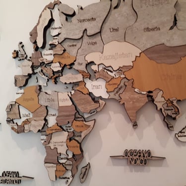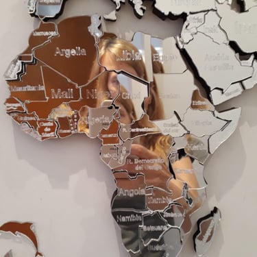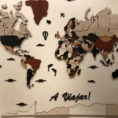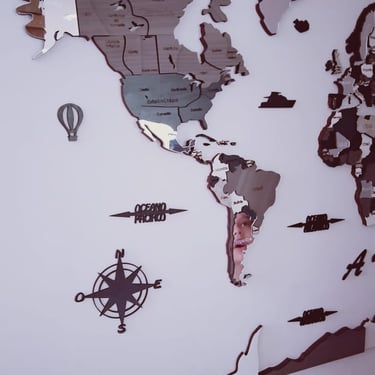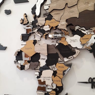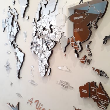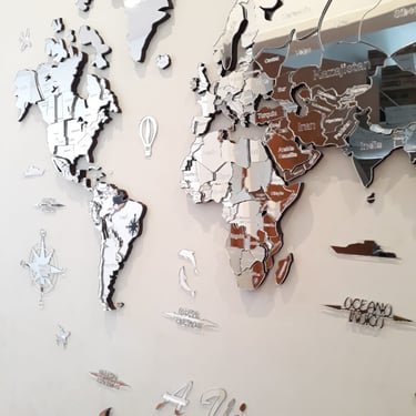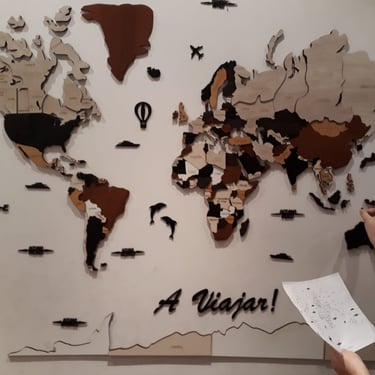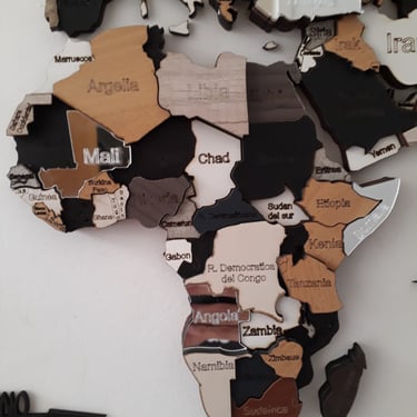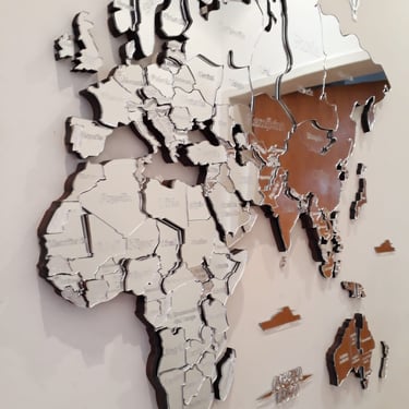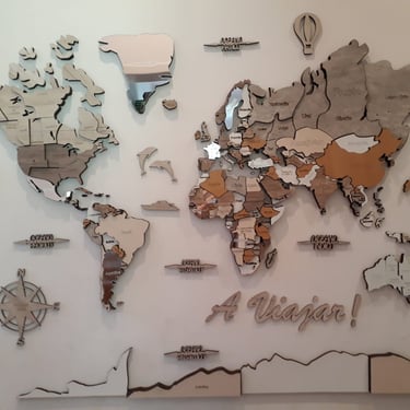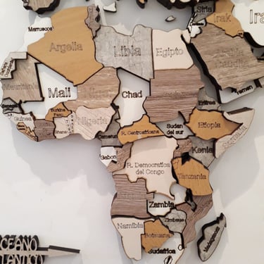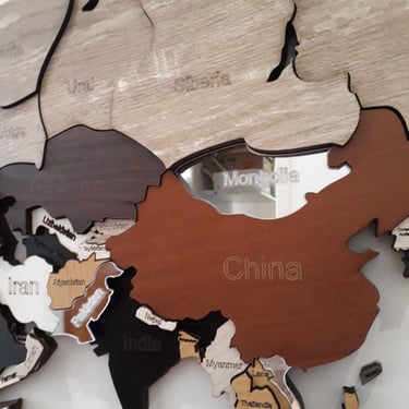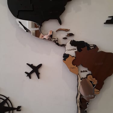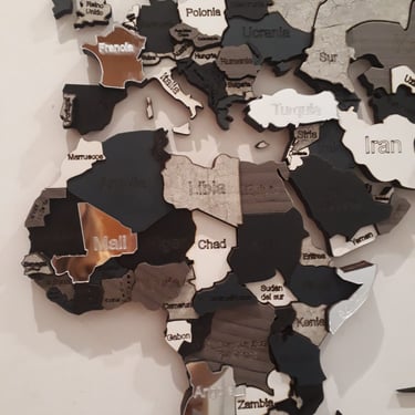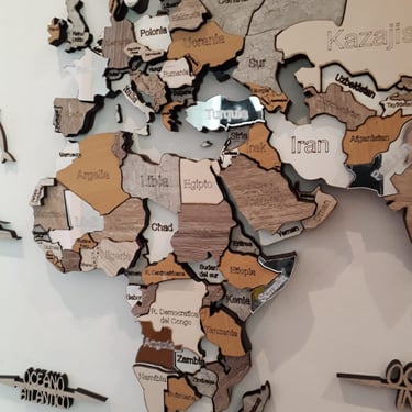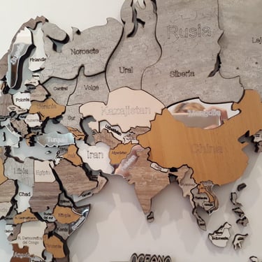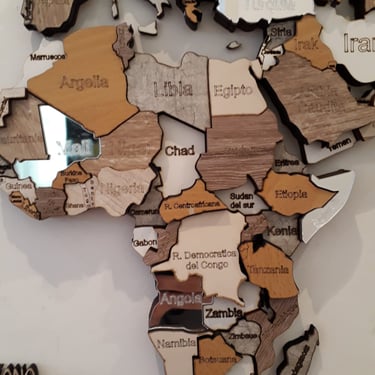 Realizado con maderas de distintos colores, con diferentes grosores para crear el efecto de 3 dimensiones. Además los países realizados con superficie espejada les da un punto más de interés.