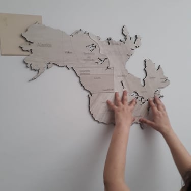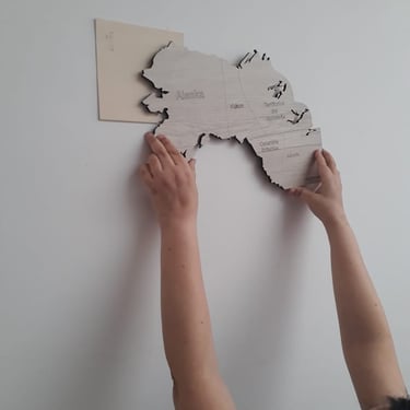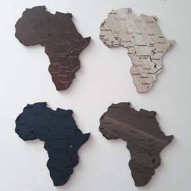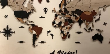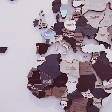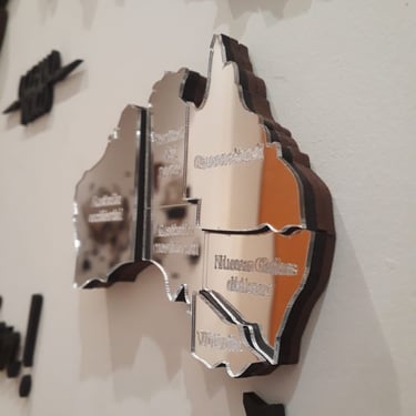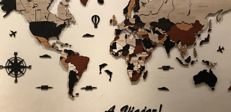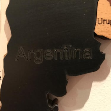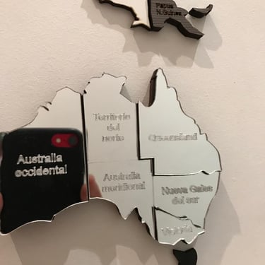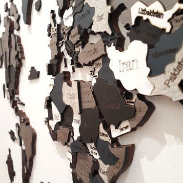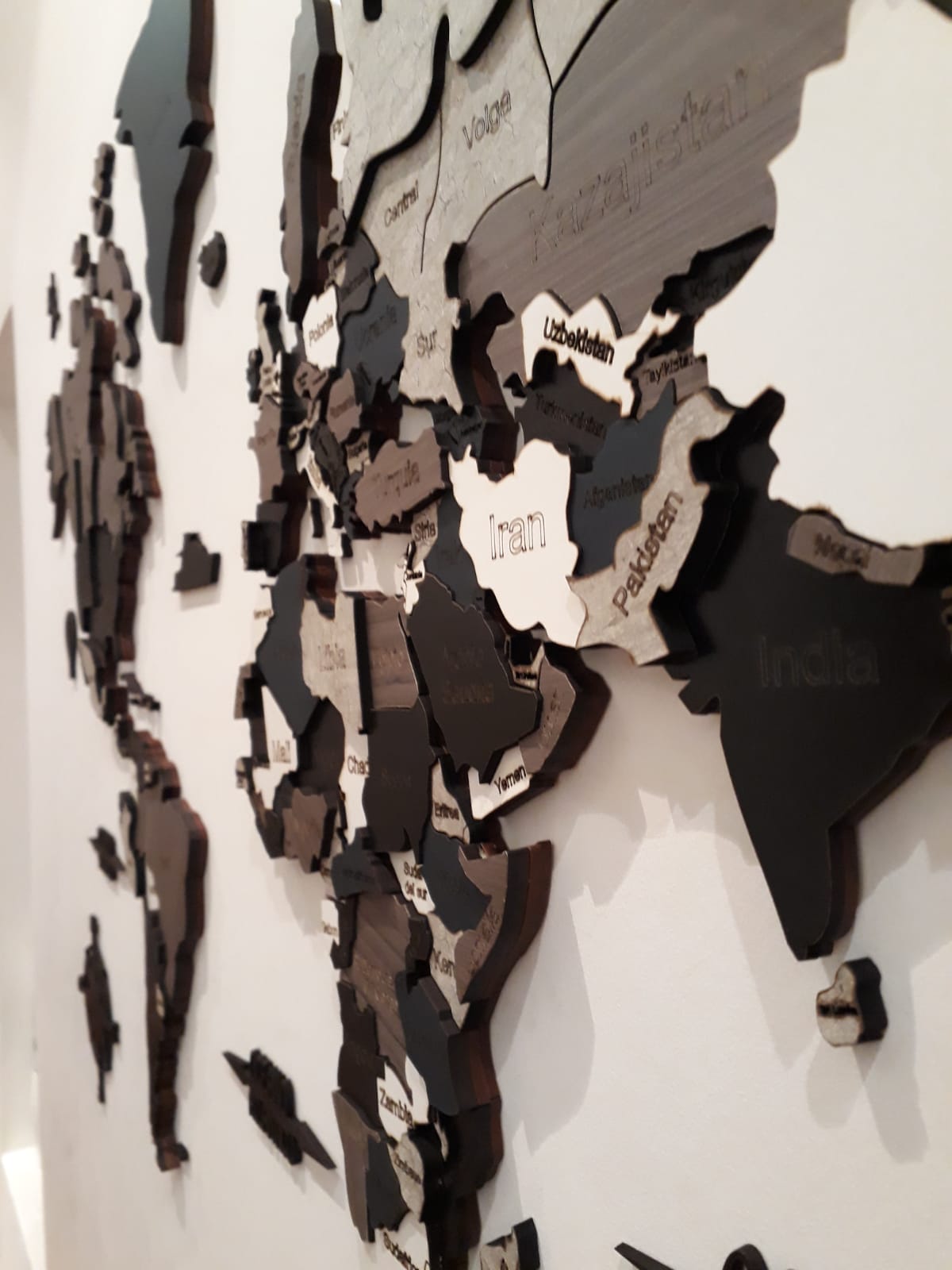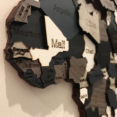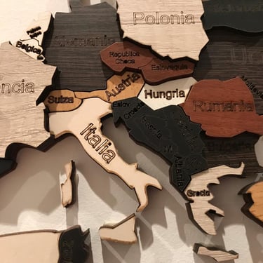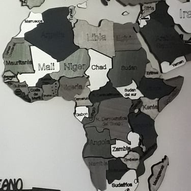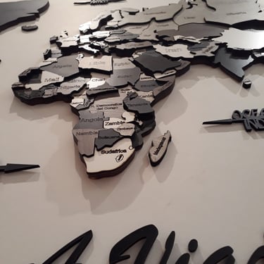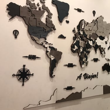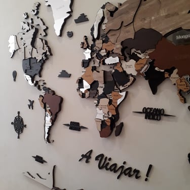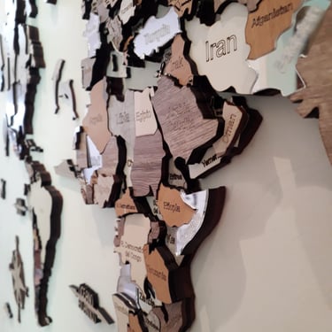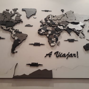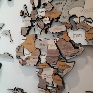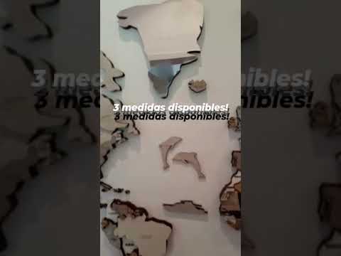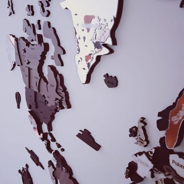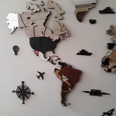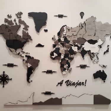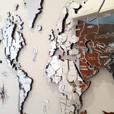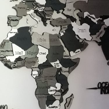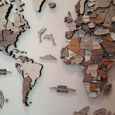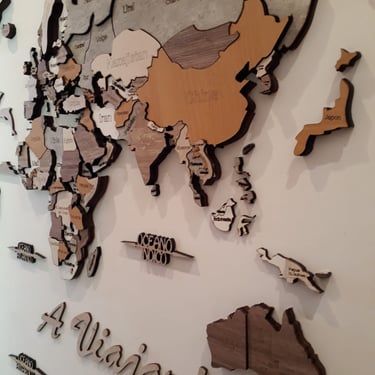 Realizado con maderas de distintos colores, con diferentes grosores para crear el efecto de 3 dimensiones. Además los países realizados con superficie espejada les da un punto más de interés.